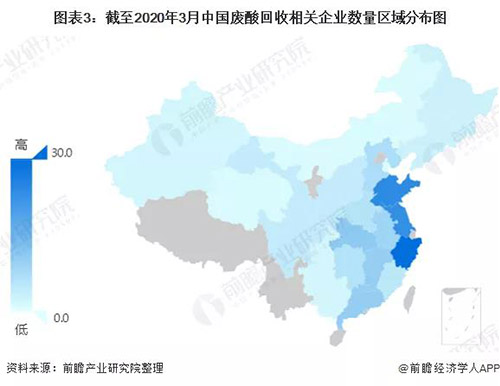 通過企查貓網站對廢酸回收業務相關企業進行篩選統計分析,截至2020年3月,中國廢酸回收相關企業數量為177家,其中,浙江、山東、江蘇三省廢酸回收企業數量排名前三,分別為30家,24家和23家。