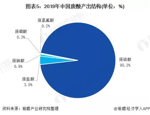 2019年,中國廢酸總產量為9479萬噸,同比下降3.9%。廢硫酸為主要主要廢酸產出種類,2019年,廢硫酸產出量為9020萬噸左右,占廢酸產出量的95.2%。